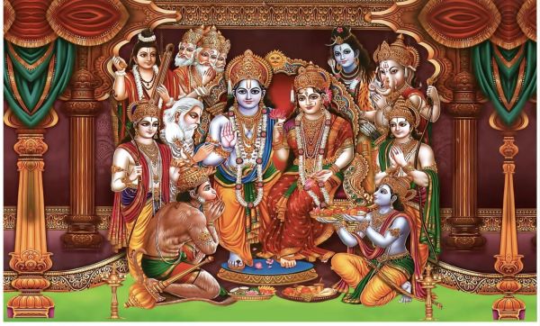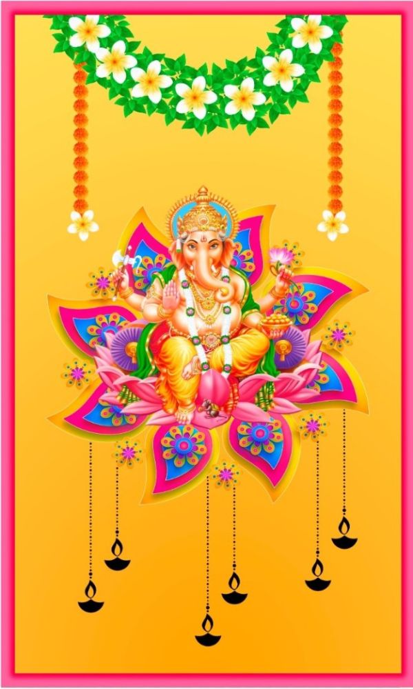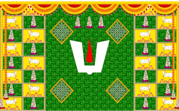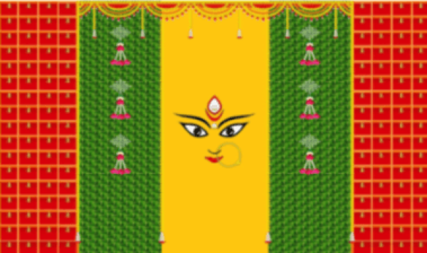 Varalakshmi Devi Backdrop with side Banana Trees on Red Background