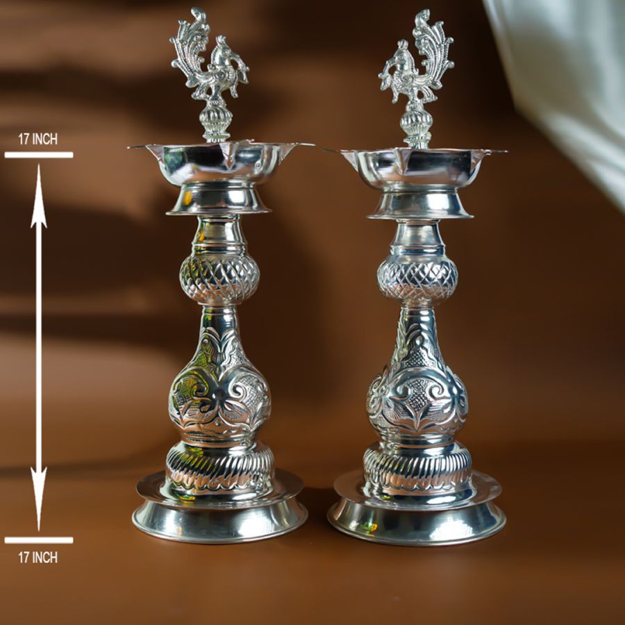 The 17 Inch Heavy Diyas are meticulously handcrafted from premium German Silver, offering a blend of traditional aesthetics and modern craftsmanship. Standing at an impressive height of 17 inches, these diyas are designed to serve as majestic centerpieces in temples, pooja rooms, and during grand festive occasions.