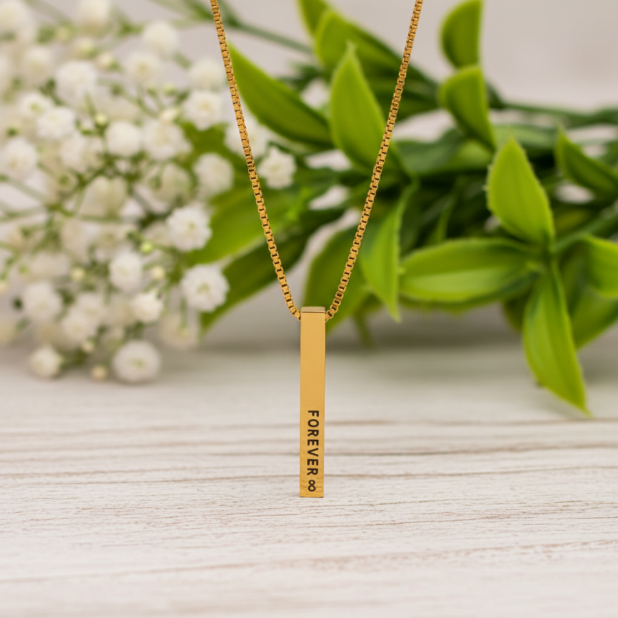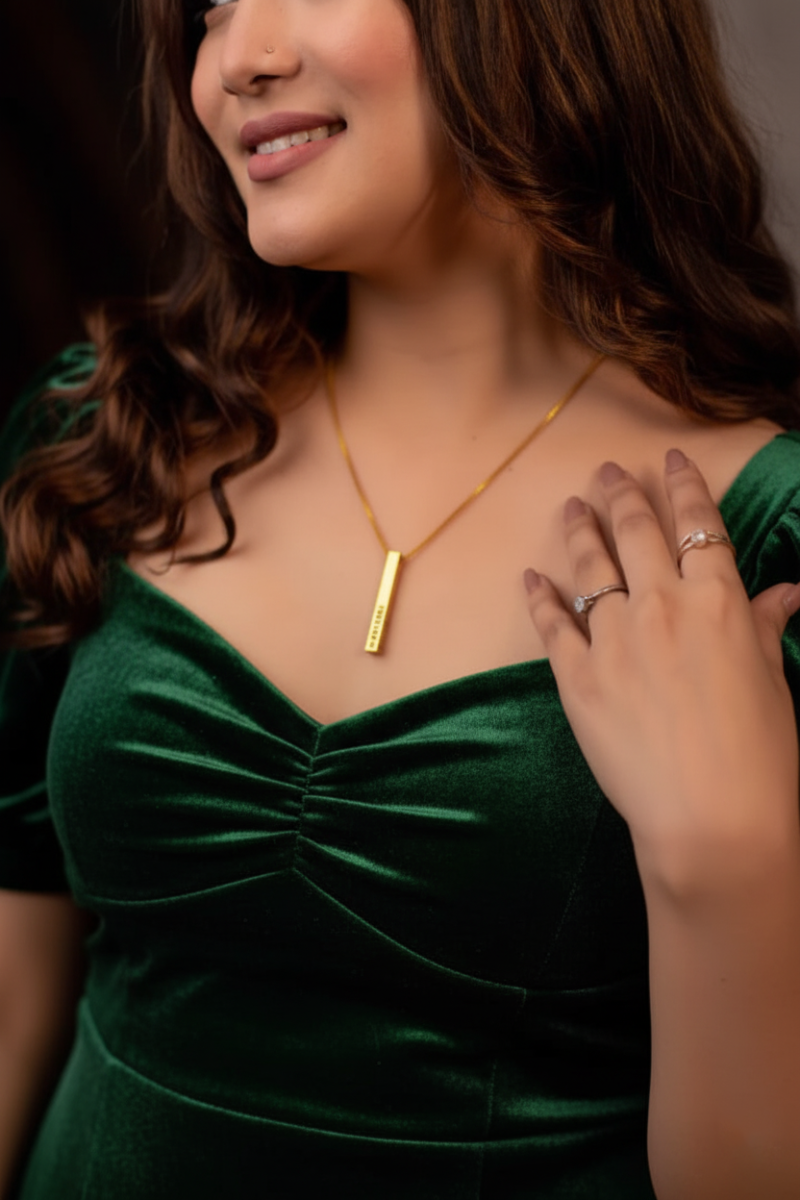 "The 22kt Gold Plated Memory Bar Necklace is the perfect piece of personalized jewelry to keep your most cherished memories close to your heart. Crafted with a stunning 22kt gold plating, this necklace is both elegant and timeless. Featuring a sleek bar design, it can be engraved with names, special dates, or meaningful words, making it a thoughtful gift for someone special or a memorable addition to your own jewelry collection.