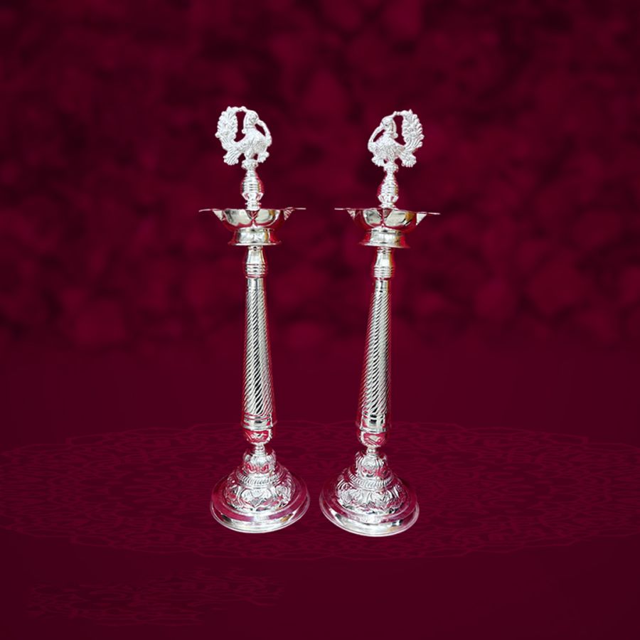 Enhance your sacred space with the commanding presence of this 30‑inch German Silver Diya, handcrafted to reflect both grandeur and devotion. This majestic piece is designed to elevate pooja halls, temple interiors, and large-scale festive decor with its elegant form and artisan detailing