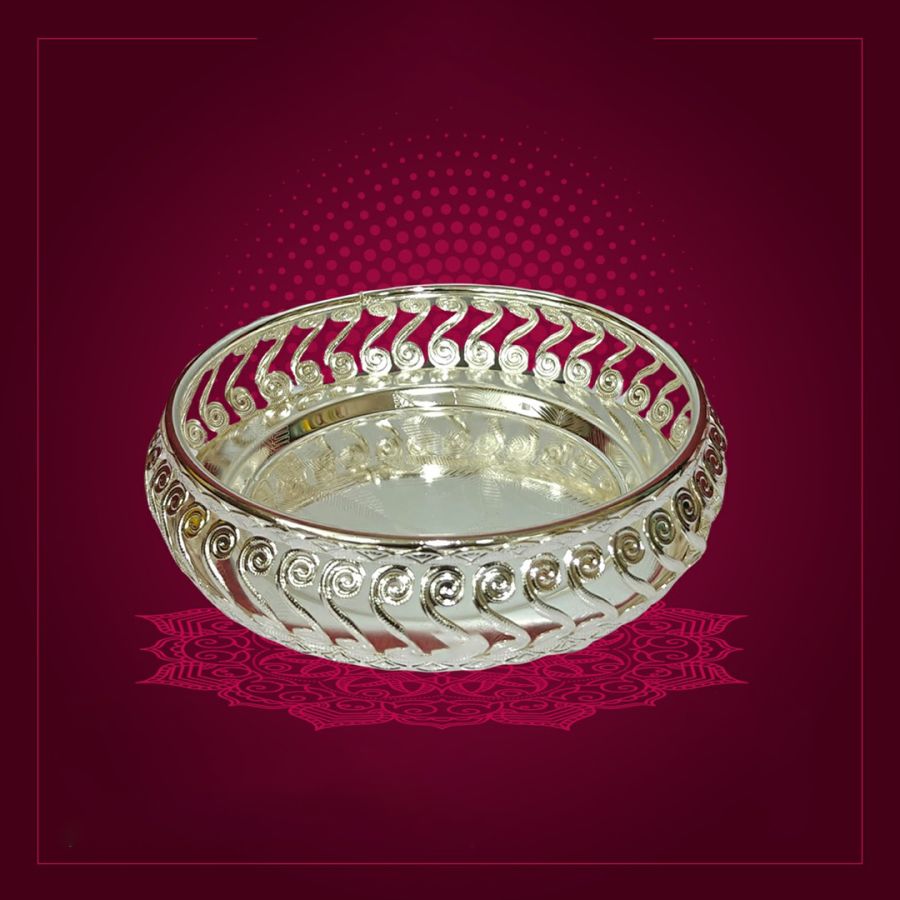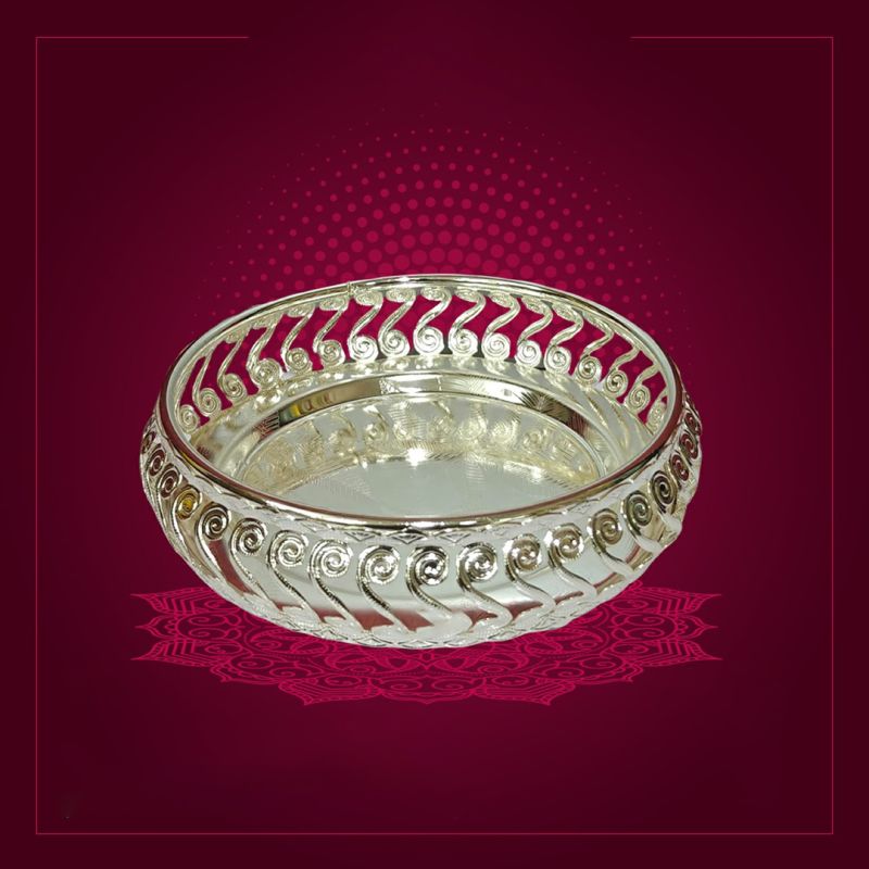 "Enhance your pooja ceremonies and festive occasions with this 5 German Silver Tray (Set of 10) — a amazing aggregate of beauty and software. Crafted from outstanding German Silver alloy, each tray talents difficult traditional etching and a complicated end, making them perfect for serving offerings, placing diyas, or gifting at some stage in special events.
