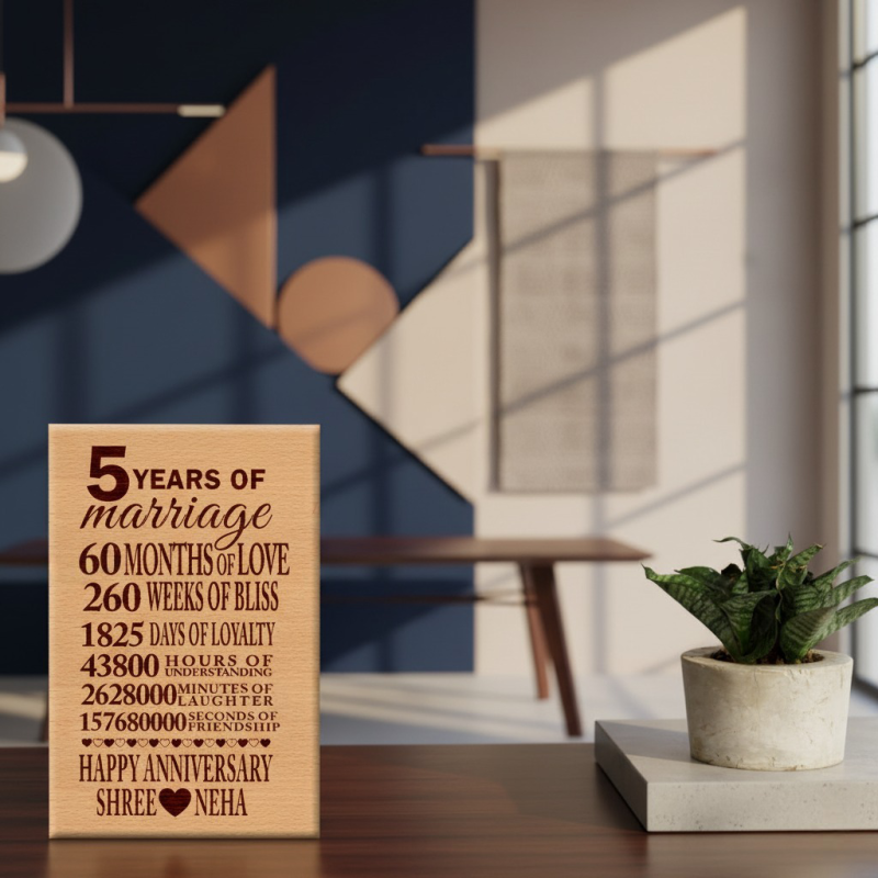 "Celebrate your special bond with the 5 Years of Marriage Frame—a beautifully crafted keepsake that marks a milestone in your marital journey. This personalized frame offers a unique and sentimental way to commemorate five years of love, laughter, and togetherness. Engraved with meaningful text and custom details, it serves as a constant reminder of the memories created over the years. Perfect for anniversaries, this frame can be personalized to include your names, wedding date, or a special message, making it an unforgettable gift for your spouse or loved one.