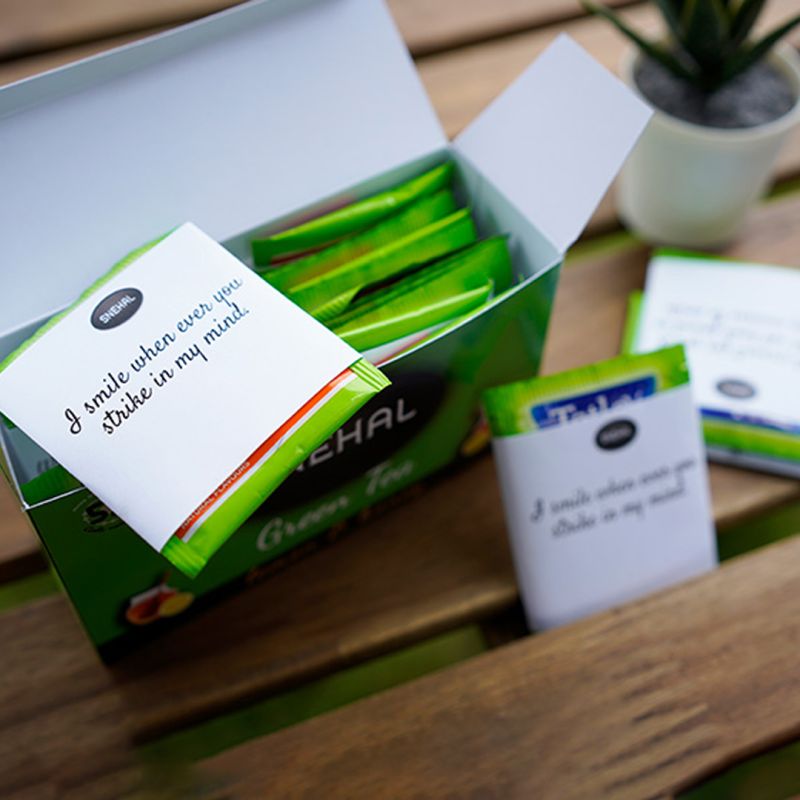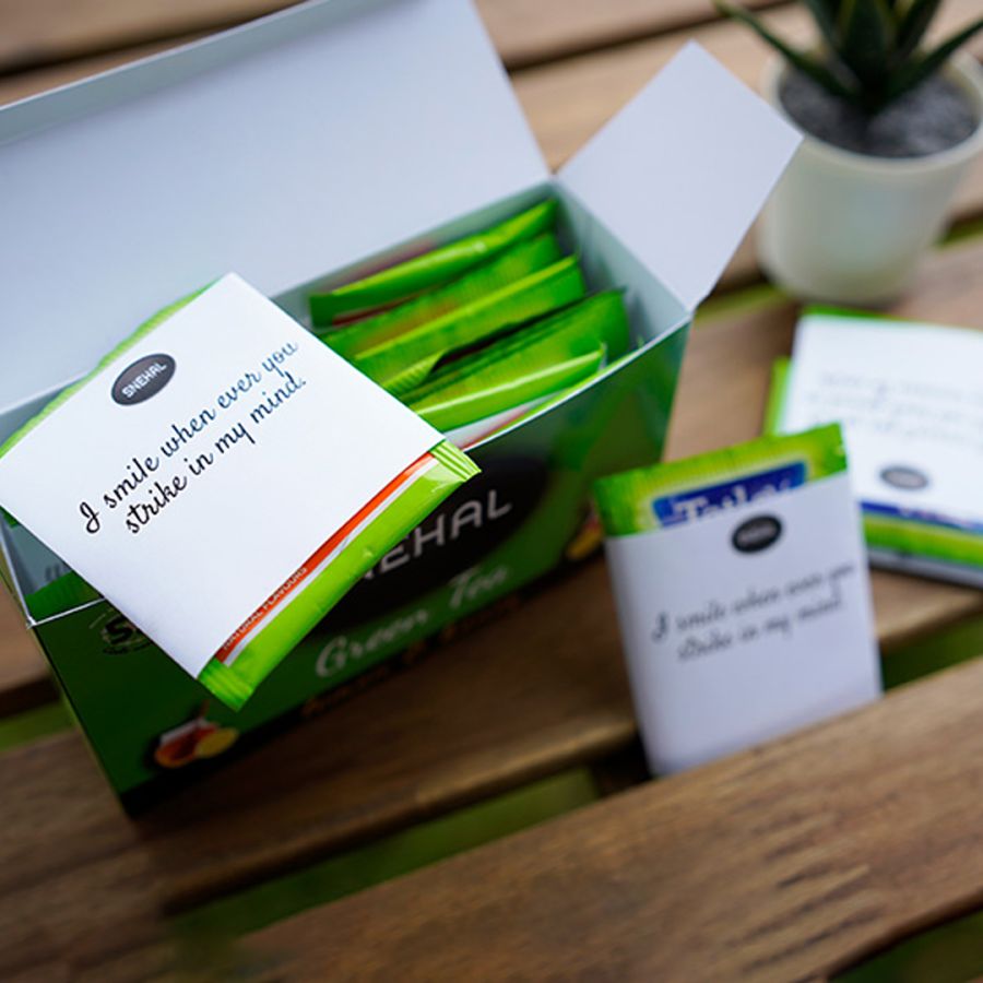 "A custom-branded green tea box with 20 tea bags with positive messages to start the morning with.