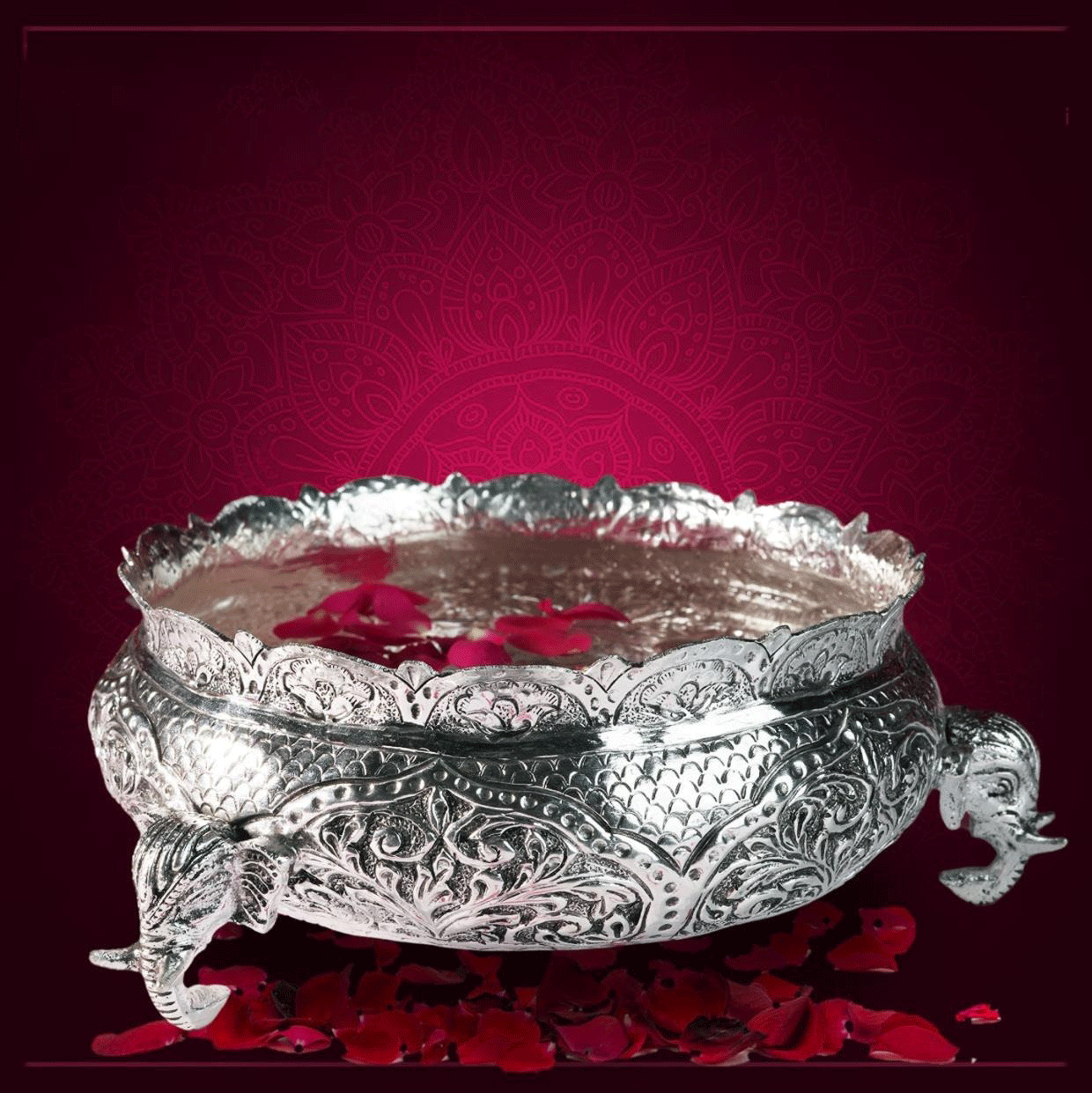 Use this beautiful Antique German Silver Urli to elevate your spiritual routines and home decor. At 8 inches across, this piece is a high quality German Silver urli that has an exquisite emblematic motif which embodies tradition and poise. This urli will surely find it's place from an abhishekam to serving of prasadam - gracing any altar or center table with decorum and calm. Its antique finish and the lasting strength of German Silver bring both beauty and durability, making it ideal for sacred spaces.