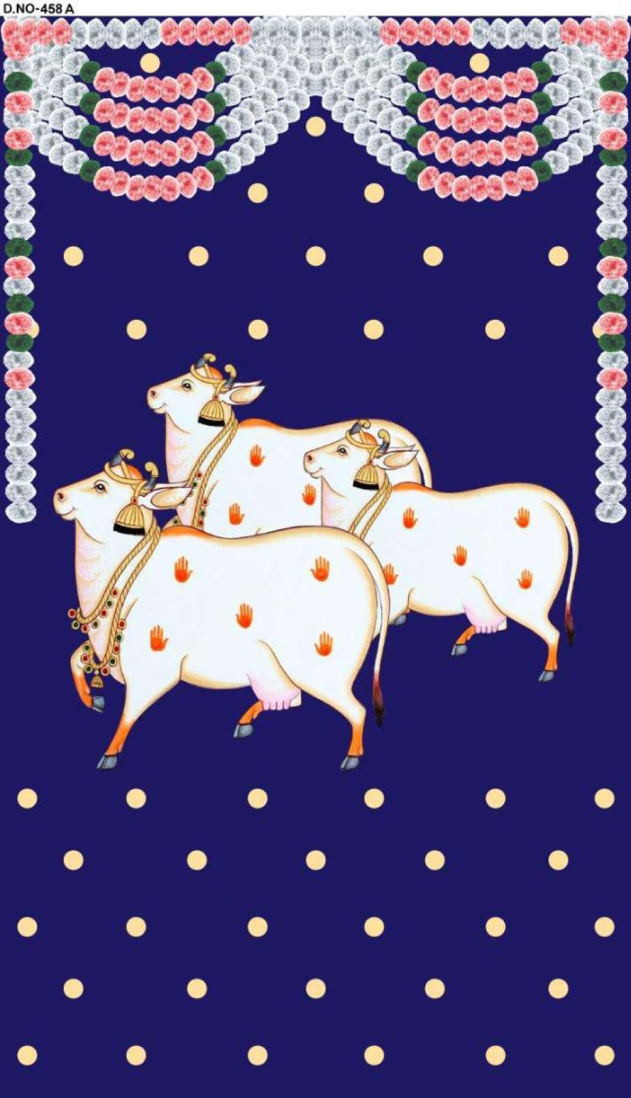 Featuring an auspicious Gomatha (sacred cow) motif set against a rich blue background — symbolising serenity, devotion and cultural harmony.