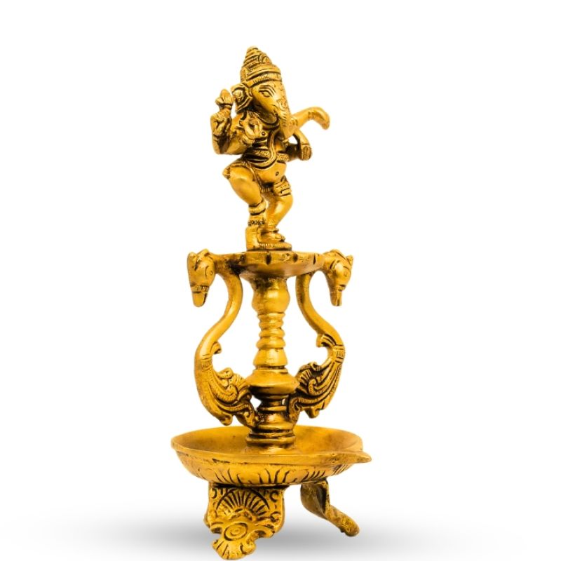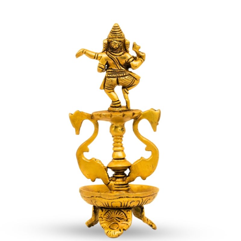 Lord Ganesha, the remover of obstacles and the deity of wisdom, success, and prosperity, is widely worshipped in Hindu culture.This beautifully crafted piece features Lord Ganesha in a dancing posture, symbolizing joy, energy, and cosmic rhythm, along with two swans and an oil diya, representing purity and enlightenment. Perfect for home temples, living rooms, offices, or as a thoughtful gift, this brass artifact radiates positive energy and divine blessings.
