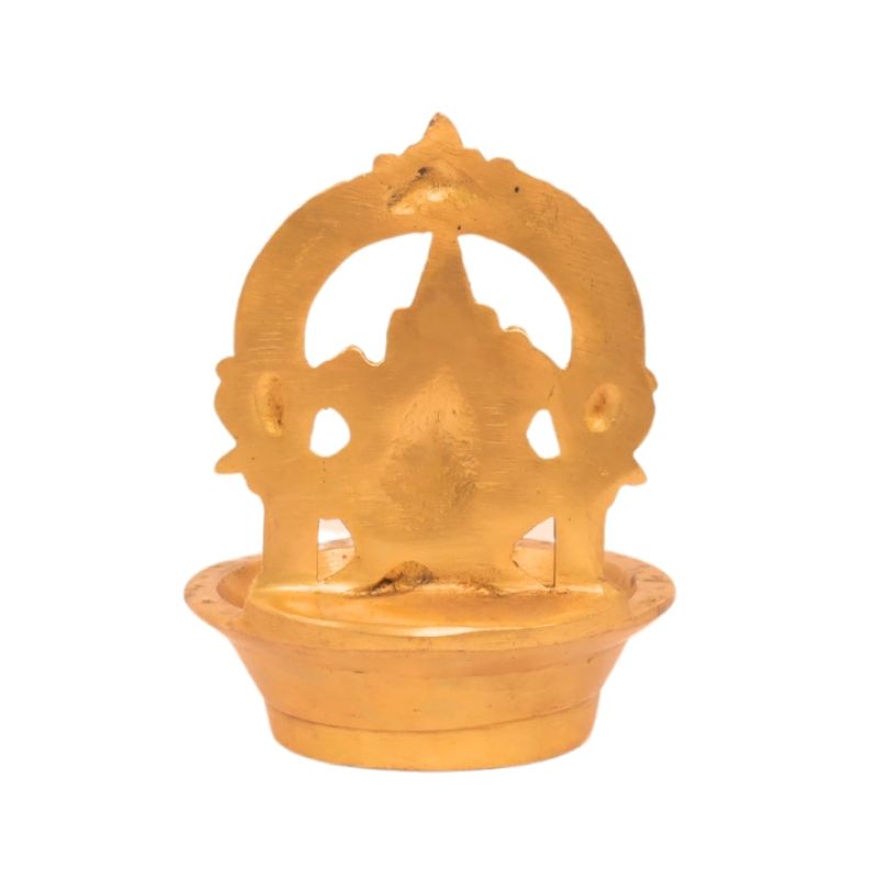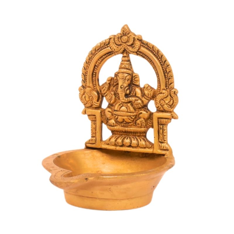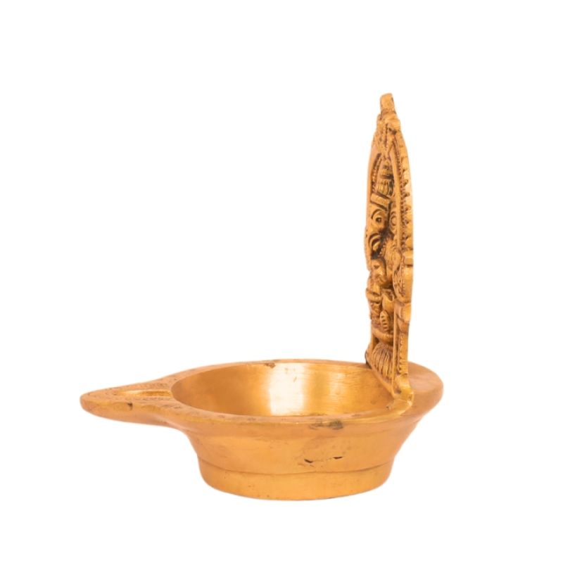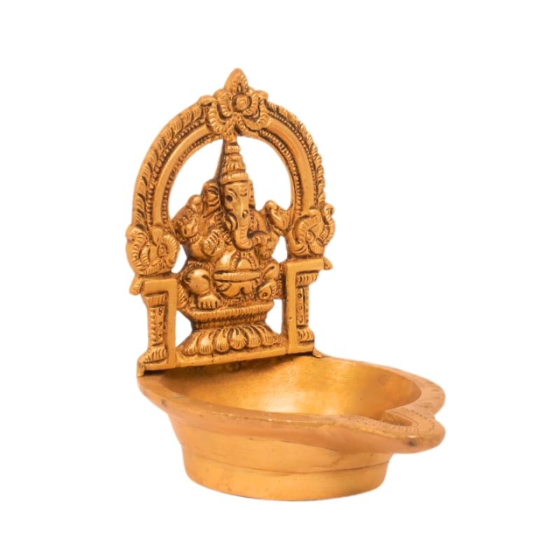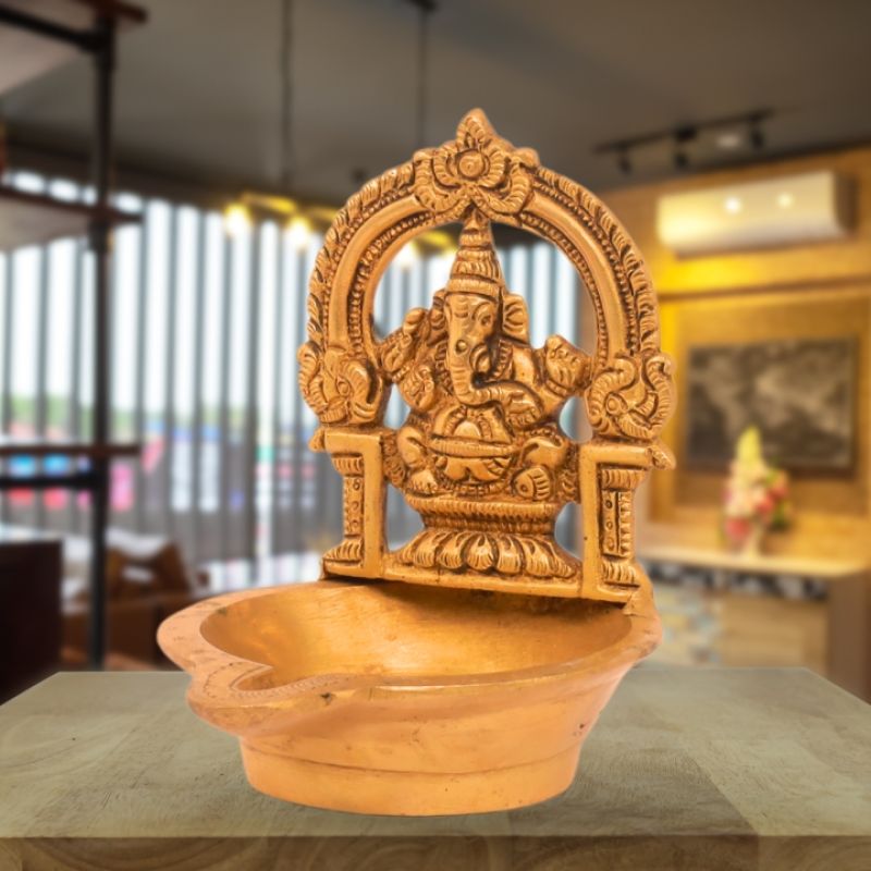 Handcrafted from high-quality solid brass, it features Lord Ganesha—the remover of obstacles and the god of wisdom—seated or embossed above the diya, blessing your surroundings with peace, prosperity, and positivity. Ideal for daily puja, festive rituals, or as a thoughtful gift during housewarmings or religious occasions.