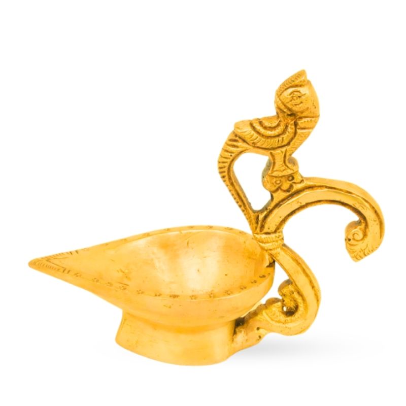 Illuminate your space with elegance and divine light using this Brass Peacock Handle Design Diya. Featuring a beautifully crafted peacock handle, this diya is perfect for adding a traditional touch to your home, office, or temple décor, while enhancing the spiritual ambiance with its warm glow.