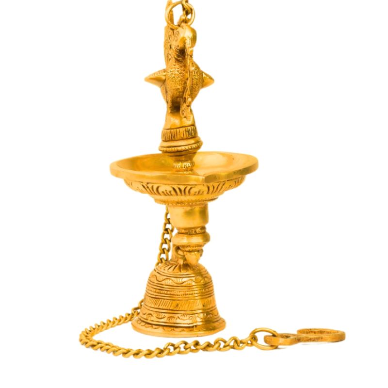 Illuminate your sacred space with this elegant Brass Wall Hanging Diya featuring a beautifully detailed peacock design and a hanging bell. Symbolizing grace, purity, and spiritual awakening, the peacock adds a touch of divine charm to this traditional oil lamp.