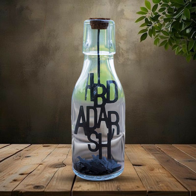 The bottle displays one message cut into a compound shape, hanging from the top. The full-size message, bottled up.