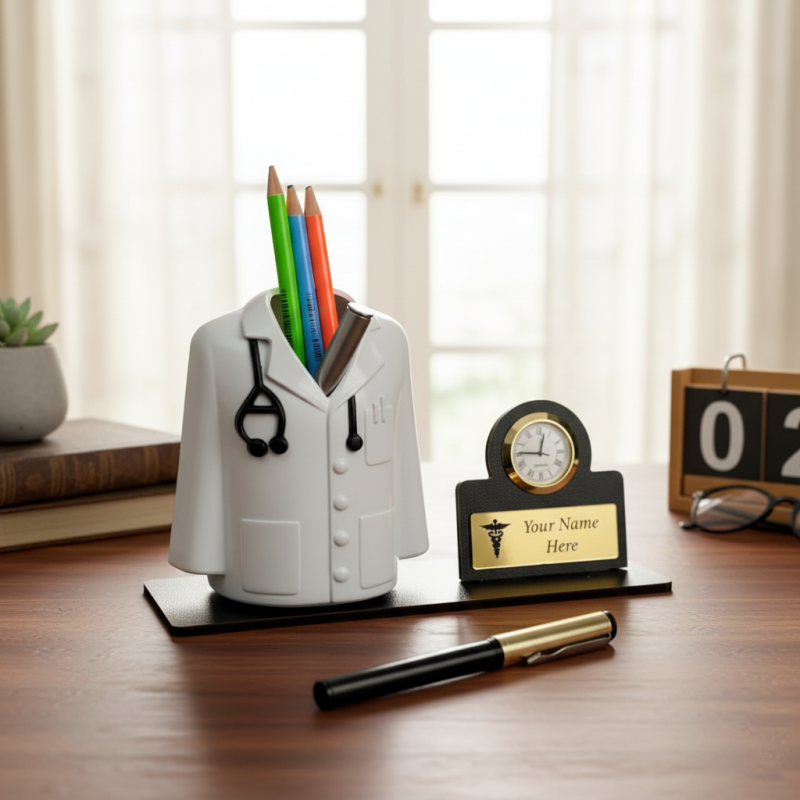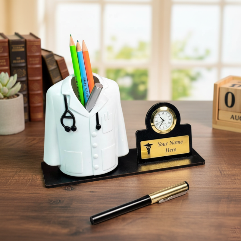 Celebrate the dedication of medical professionals with this uniquely designed Custom Doctor Pen Stand with Clock. Crafted to resemble a doctor's coat, this desk organizer combines functionality with a touch of personalization. It features a working clock, a pen holder, and a customizable nameplate, making it an ideal gift for doctors, medical students, or healthcare professionals. Whether for a clinic, hospital, or study desk, this organizer adds a professional and personal touch to any workspace.