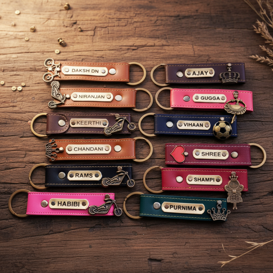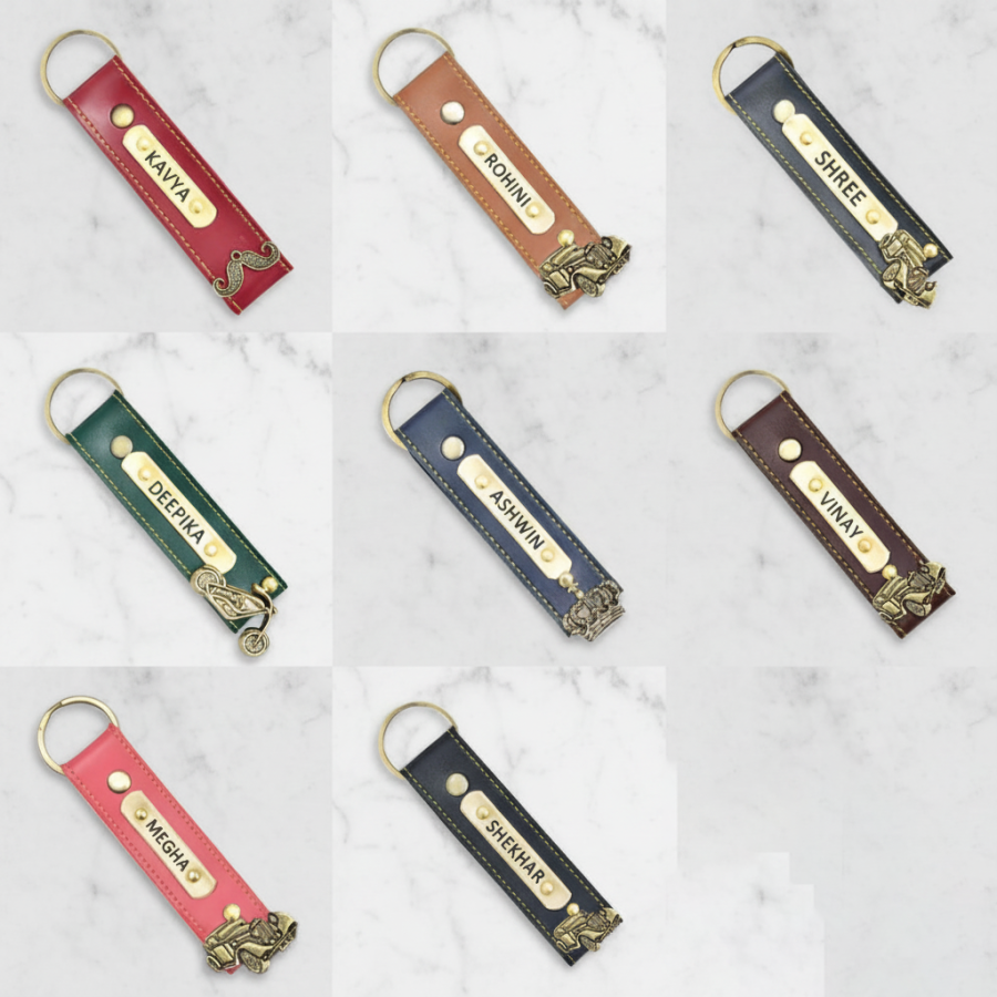 Add a touch of elegance to your essentials with this Personalised Leather Keychain in Wine. Crafted from high-quality synthetic leather, this keychain combines durability with a sleek design. It features a customizable name strip and a charm, making it a perfect gift for loved ones or a stylish accessory for yourself. The rich wine color adds a sophisticated flair, while the gold-toned hardware enhances its luxurious appeal.