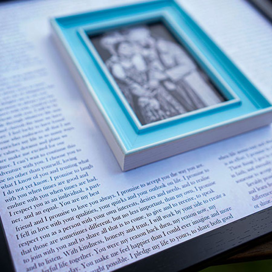 "Frame in a frame, a special picture pastel frame mounted on a bigger frame with messages/wedding vows.