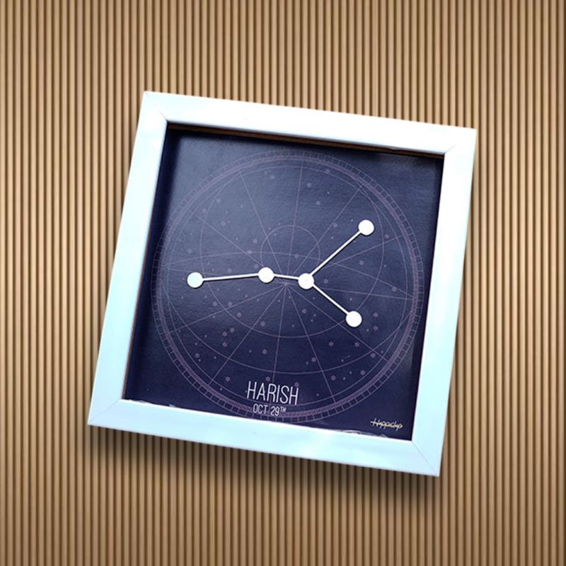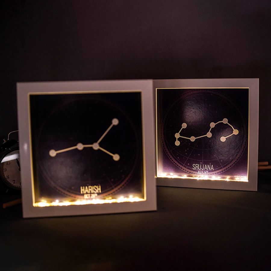 The respective constellation of the person is cut and depicted in a night sky design in 3D, along with the name and the birthdate in the design.