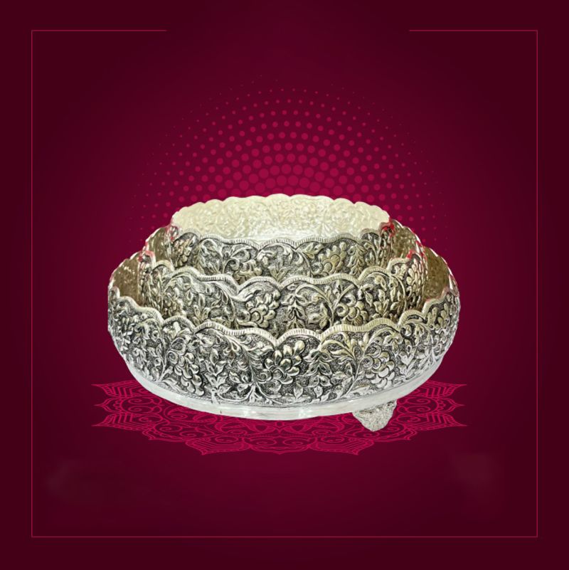 This 12‑inch antique urli plate is crafted from premium German silver and features embossed floral and temple motifs that lend it a timeless, sacred appeal. The antique silver polish enhances its vintage charm, making it an ideal centerpiece for pooja décor, floating flowers, or diya arrangements. With a sturdy build and medium‑heavy weight, it ensures stable placement while retaining elegance. The urli arrives in cushioned packaging to protect its finish and delicate details. For maintenance, gently wipe with a dry soft cloth and avoid direct contact with water or harsh cleaning agents.