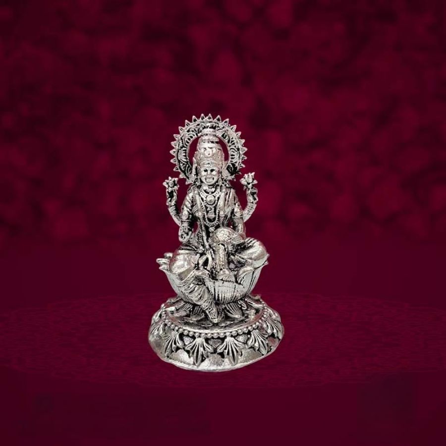 This meticulously handcrafted 4-Inch Antique Lakshmi Idol is made from high-quality German silver, showcasing intricate detailing and a polished finish. The goddess is depicted seated on a lotus, symbolizing purity and wealth, and is adorned with traditional attire and jewelry, embodying the essence of divine prosperity. Weighing approximately 200–300 grams, this idol is ideal for placement in home temples, during pooja ceremonies, or as a thoughtful gift for festivals like Diwali, Varalakshmi Vratham, and weddings. Its compact size and elegant design make it a versatile addition to any spiritual setting. To maintain its shine, it is recommended to clean with a soft dry cloth and avoid exposure to moisture and harsh chemicals.