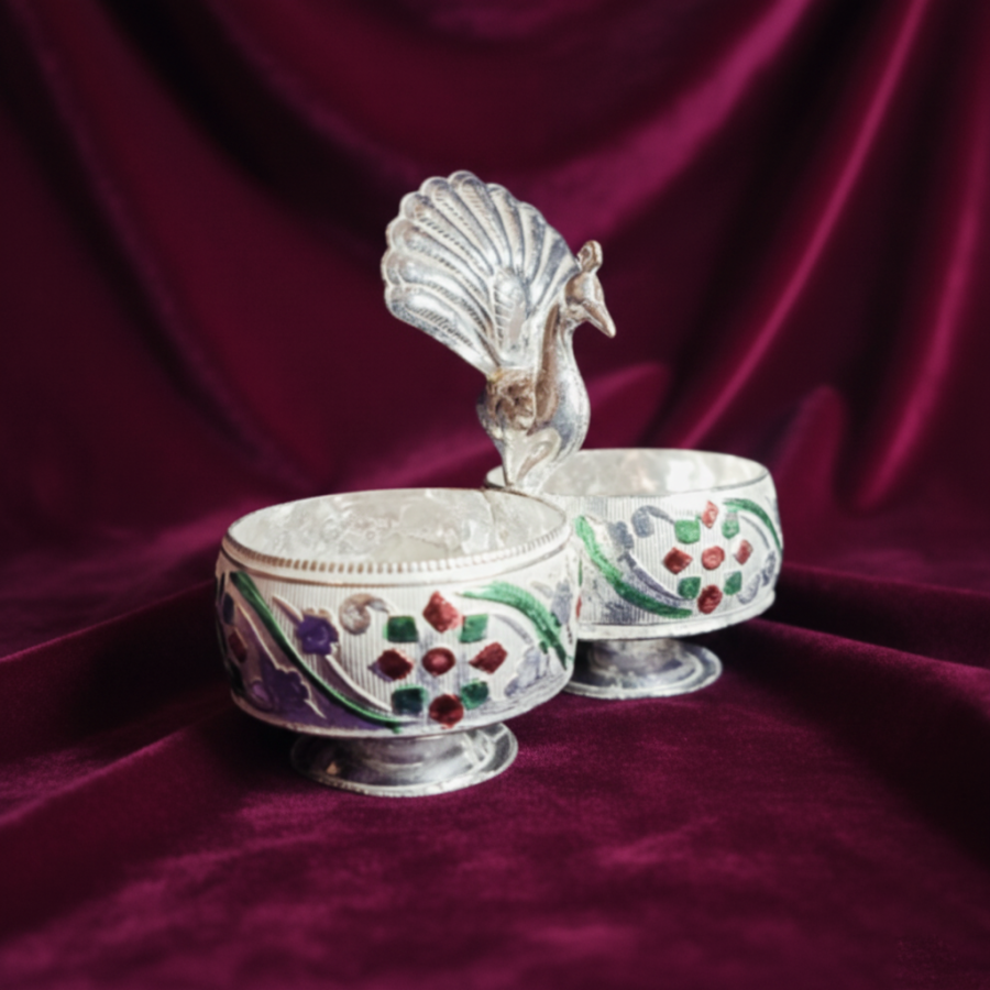 Bring elegance and tradition to your home pooja space with this beautifully crafted German silver bowl featuring an intricate peacock motif. Made from premium German silver (nickel‑silver alloy), the bowl combines durability with the lustrous look of real silver. Designed for use during rituals—such as offering prasad, kumkum, haldi or water—it also serves as an exquisite decorative piece for your temple or sacred shelf. The peacock motif symbolises beauty, prosperity and spiritual grace. Whether used daily or for special ceremonies, it’s a meaningful addition to your spiritually‑oriented home décor.