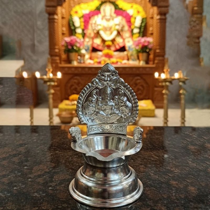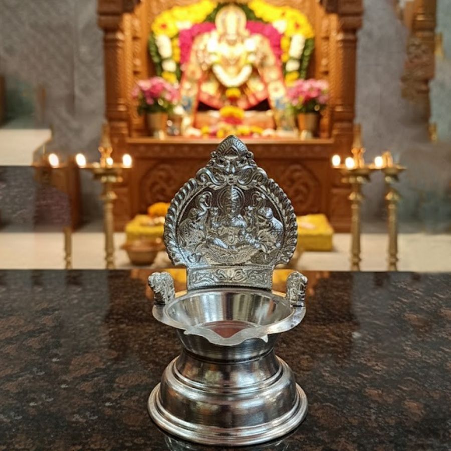 This is likely a German silver pooja vessel or decorative container, crafted in a nickel-silver alloy that gives it a lustrous, silver-like appearance without being made of pure silver. Designed for religious or ritual use, this item can hold offerings such as akshata (rice), flowers, water, or prasadam. The finish is probably polished or semi-polished, giving it an elegant and traditional look suited for a home altar or pooja room.