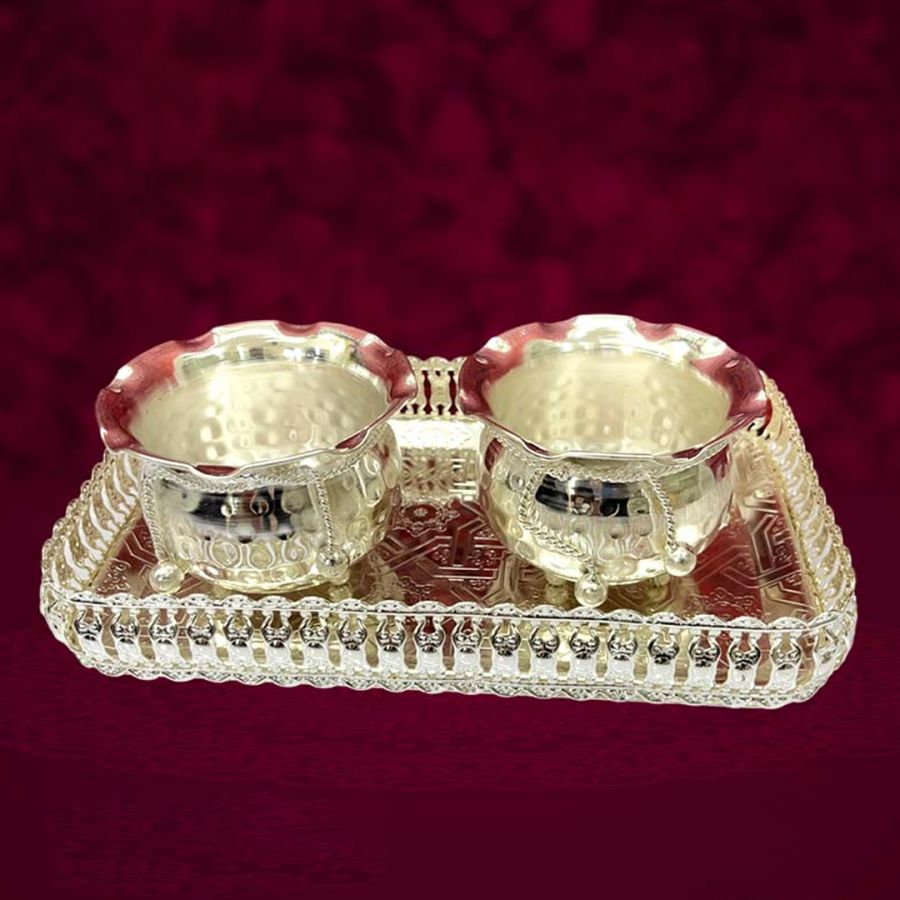 Buy eleven” Rectangular Tray with 2 Thread Bowls in German Silver. Ideal for gifting, décor, and pooja