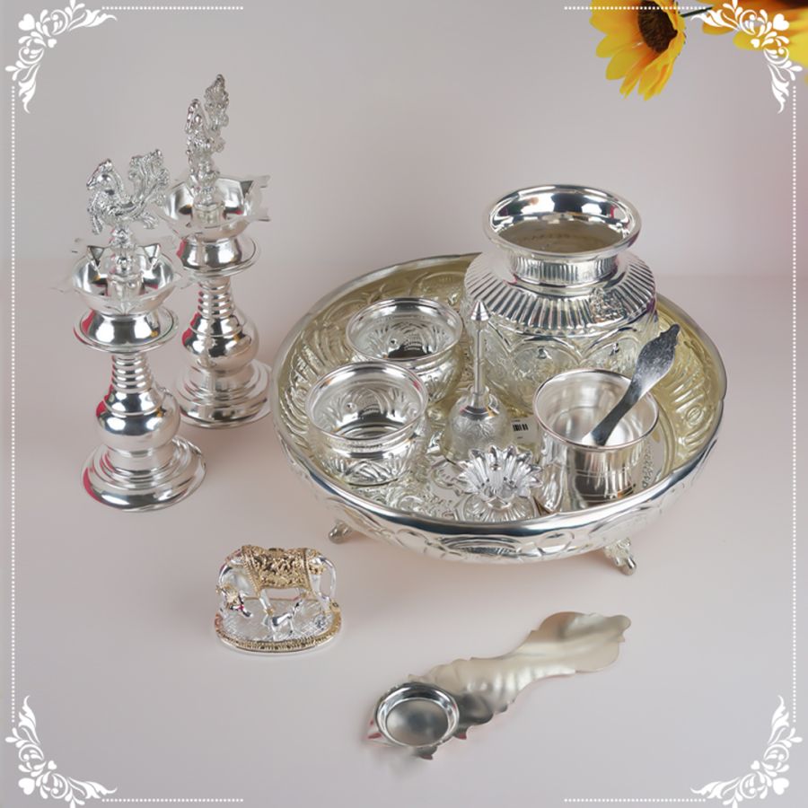 Elegant German Silver Griha Pravesh Set, Perfect for housewarming rituals and gifting.