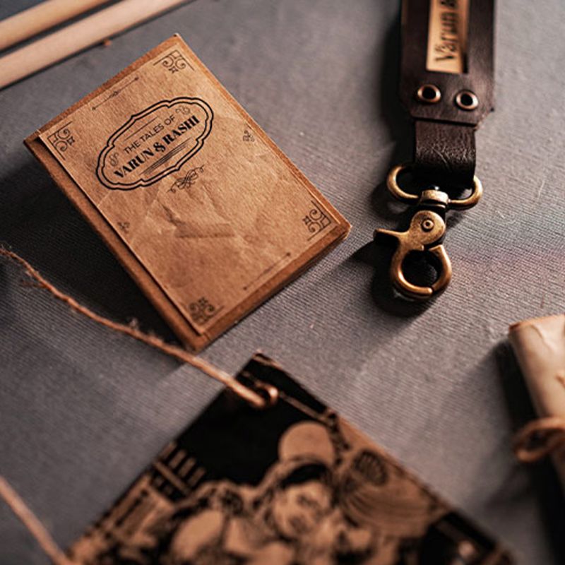 The contents of the bag are, one mini notebook with vintage papers, one picture poster in monochrome edit, a tiny message bottle with a secret message, a distressed-looking letter for your loved ones, and a leather-layered key chain.
