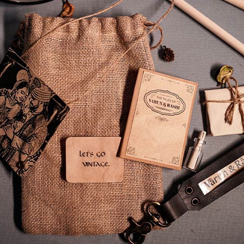 "Set of tiny vintage gifts customized with pictures, names, and messages, sealed in a jute-made gunny bag.