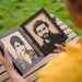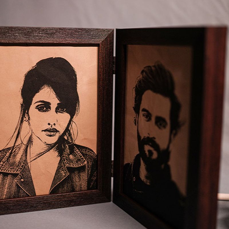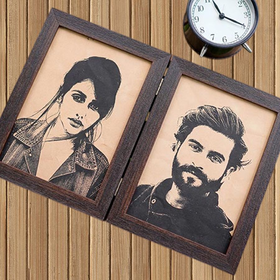 "B/W themed, monochromatic portraits on processed vintage sheets in wooden textured frames, with a hinge.