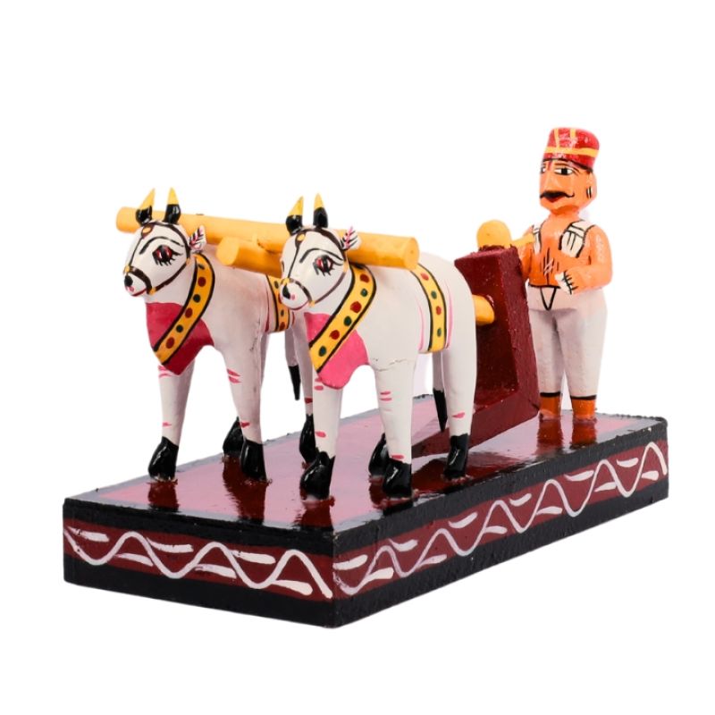 Bring the rustic charm of Indian village life into your home with this beautifully handcrafted Kondapalli Bommalu Farmer Farming with Bulls Toy. This exquisite wooden figurine captures a timeless farming scene, showcasing a farmer guiding bulls as they plow the fields—an iconic image of rural India.