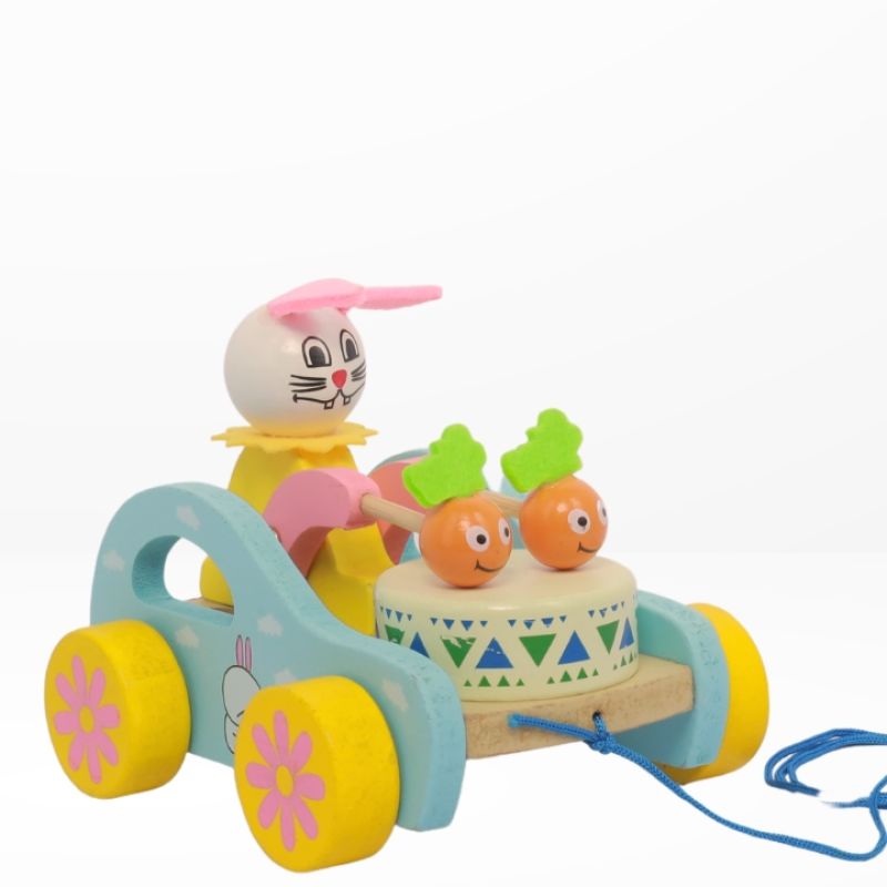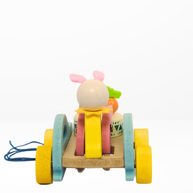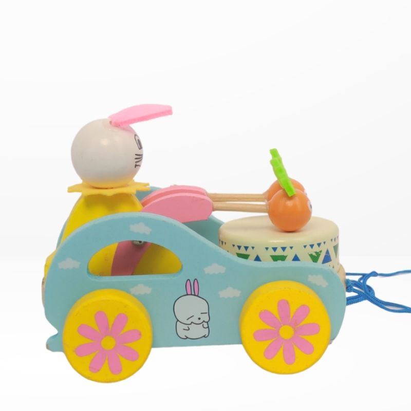 Kondapalli Wooden Beat Drum Rabbit Pull Along Car Toy for Baby Early Walking Pull Toy for Babies
