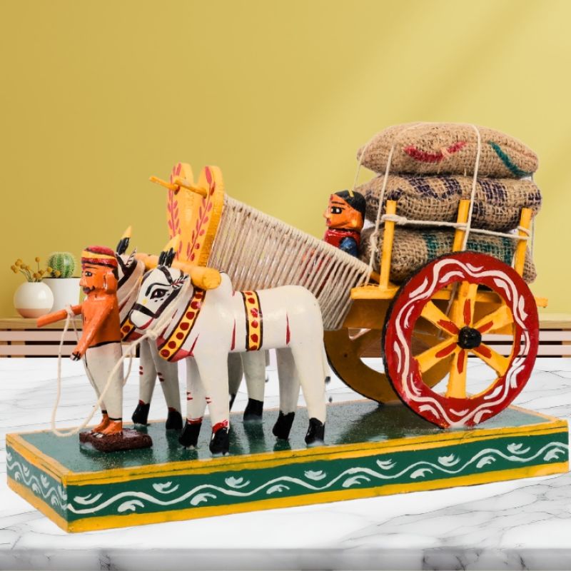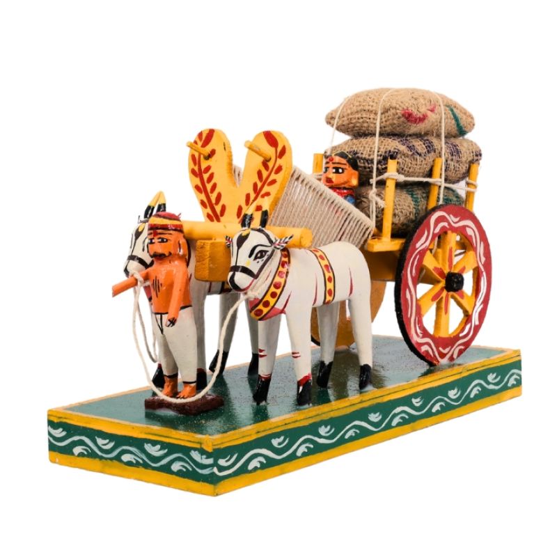 Kondapalli Wooden Bullock Cart with Farmer Couple in Multi-Colour for Home Decorative Showpiece