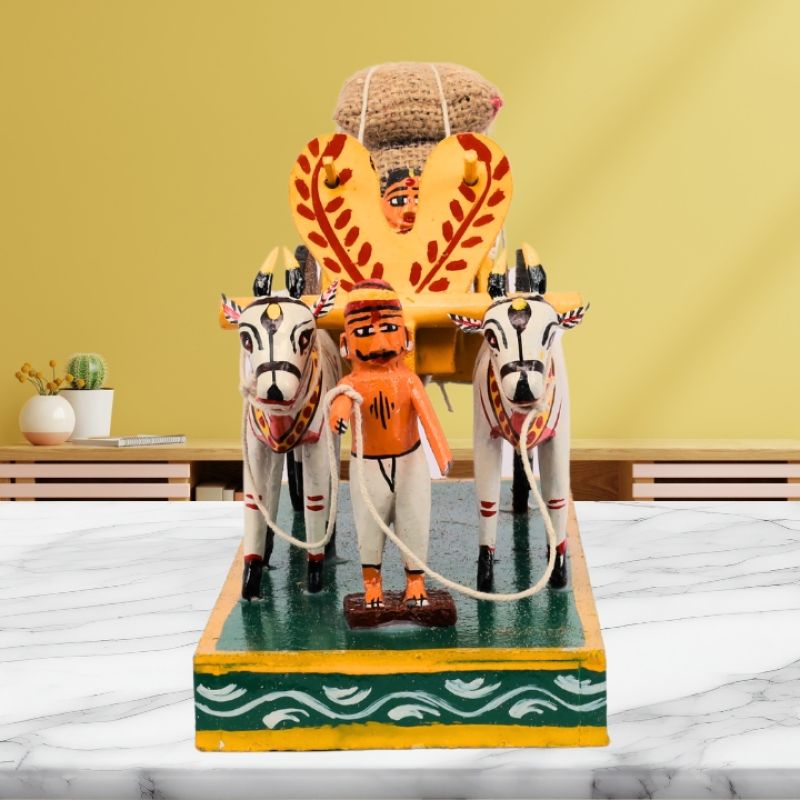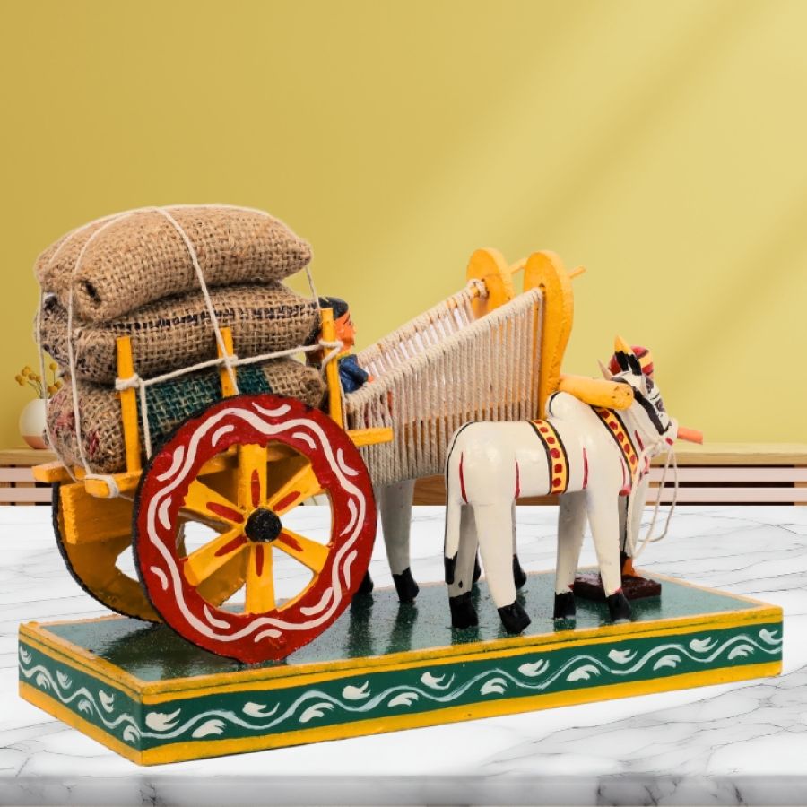 Celebrate the essence of rural Indian life with this charming Kondapalli Wooden Bullock Cart with Farmer Couple. Handcrafted and hand-painted by traditional Kondapalli artisans, this vibrant showpiece beautifully captures the harmony of village farming culture, making it a perfect accent for your home décor.