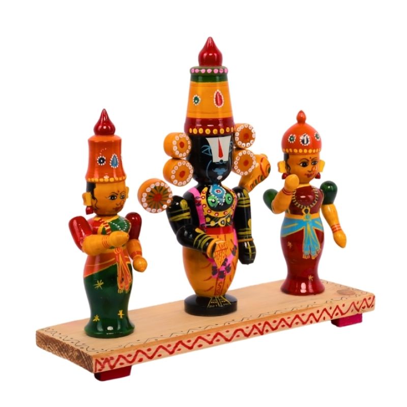 Kondapalli Wooden Lord Balaji with Padmavati and Lakshmi Devi Idol Set for Home Decor