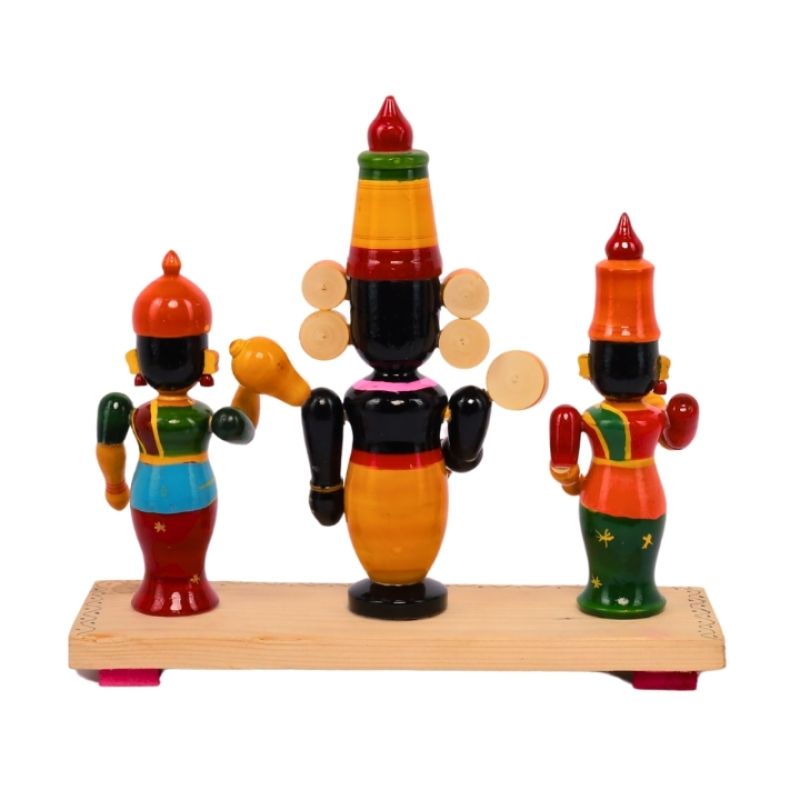 Enhance the spiritual ambiance of your home with this exquisitely handcrafted Kondapalli Wooden Idol Set featuring Lord Balaji along with Goddess Padmavati and Goddess Lakshmi Devi. Originating from Kondapalli village in Andhra Pradesh, this set beautifully captures the divine trio revered in Hindu tradition, crafted with intricate detail and vibrant colors.