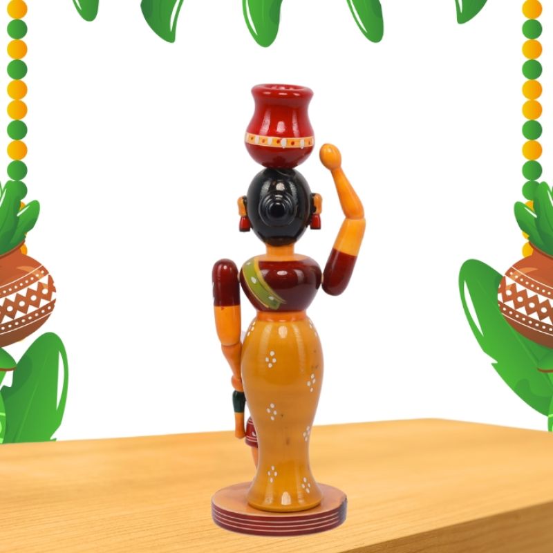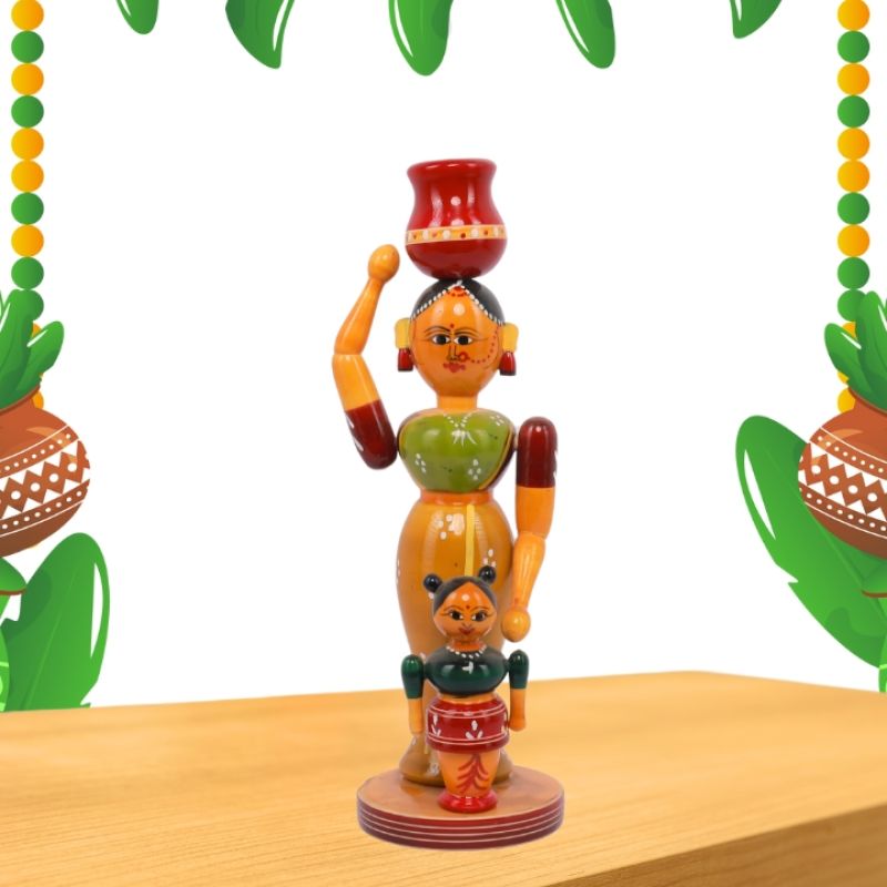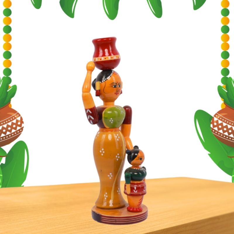 Bring a heartwarming touch of rural life and tradition into your space with this beautifully handcrafted Kondapalli Wooden Village Mother Carrying Pot with Child Idol. Made by skilled artisans from Kondapalli village, Andhra Pradesh, this exquisite figurine depicts a village mother gracefully carrying a pot on her head while lovingly holding her child, symbolizing maternal strength, care, and village culture.