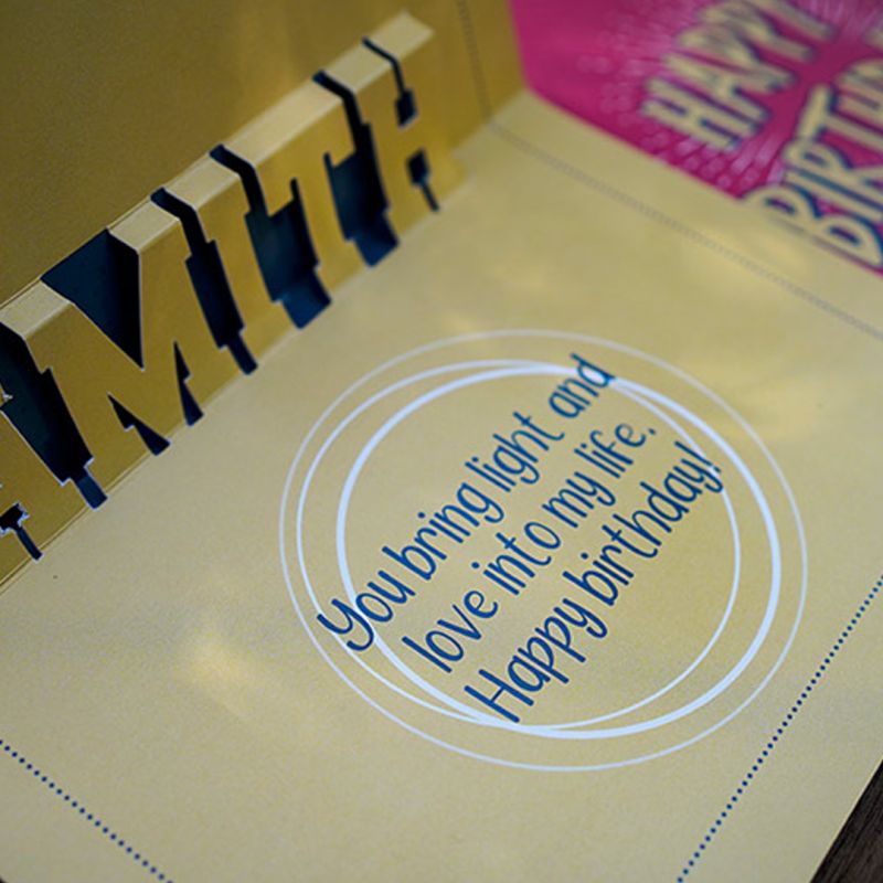 Name featured 3D greeting card that opens to the name standing out, literally.