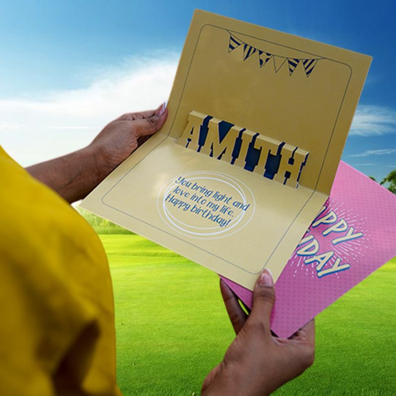 Name featured greeting card with a twist! A whole new level in greeting cards. Hit them right in surprise with the standing name!"
