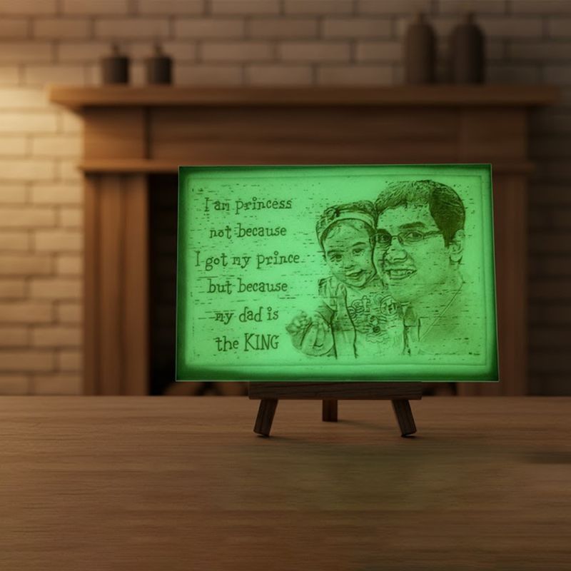 "Illuminate your memories with a touch of magic using this 4×6 Radium Engraving Photo Frame. During the day, it displays a beautifully laser‑engraved portrait or message on natural wood. When the lights go out, it glows in the dark—creating a mesmerizing effect that brings your cherished image to life in a soft, radiant glow.