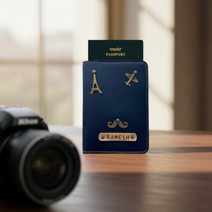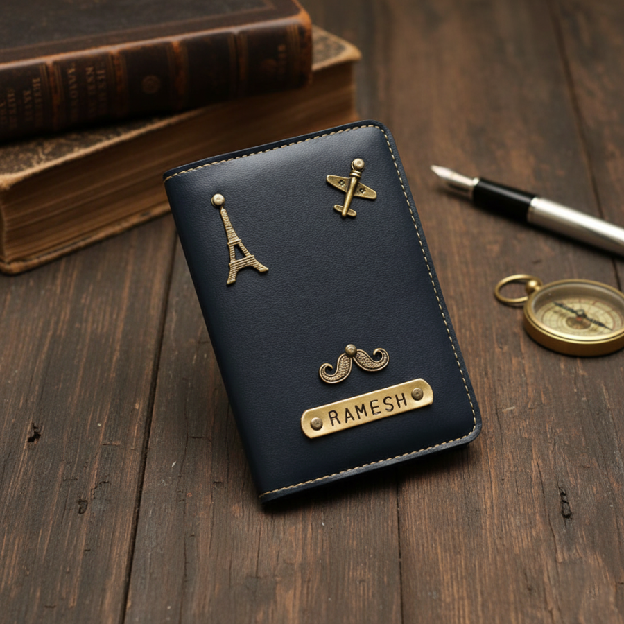 Travel in style with the Personalised Passport Cover (Blue) with One Charm. Crafted from high-quality vegan leather, this passport cover is designed to protect your passport while adding a touch of elegance to your travel accessories. The rich blue color is complemented by a customizable name tag and a choice of one metal charm, making it a unique and thoughtful gift for travelers. Whether you're heading on a business trip or a vacation, this passport cover ensures your travel documents are both secure and stylish.
