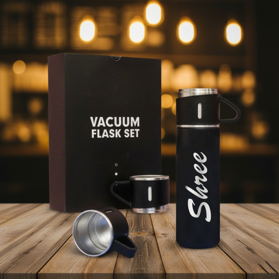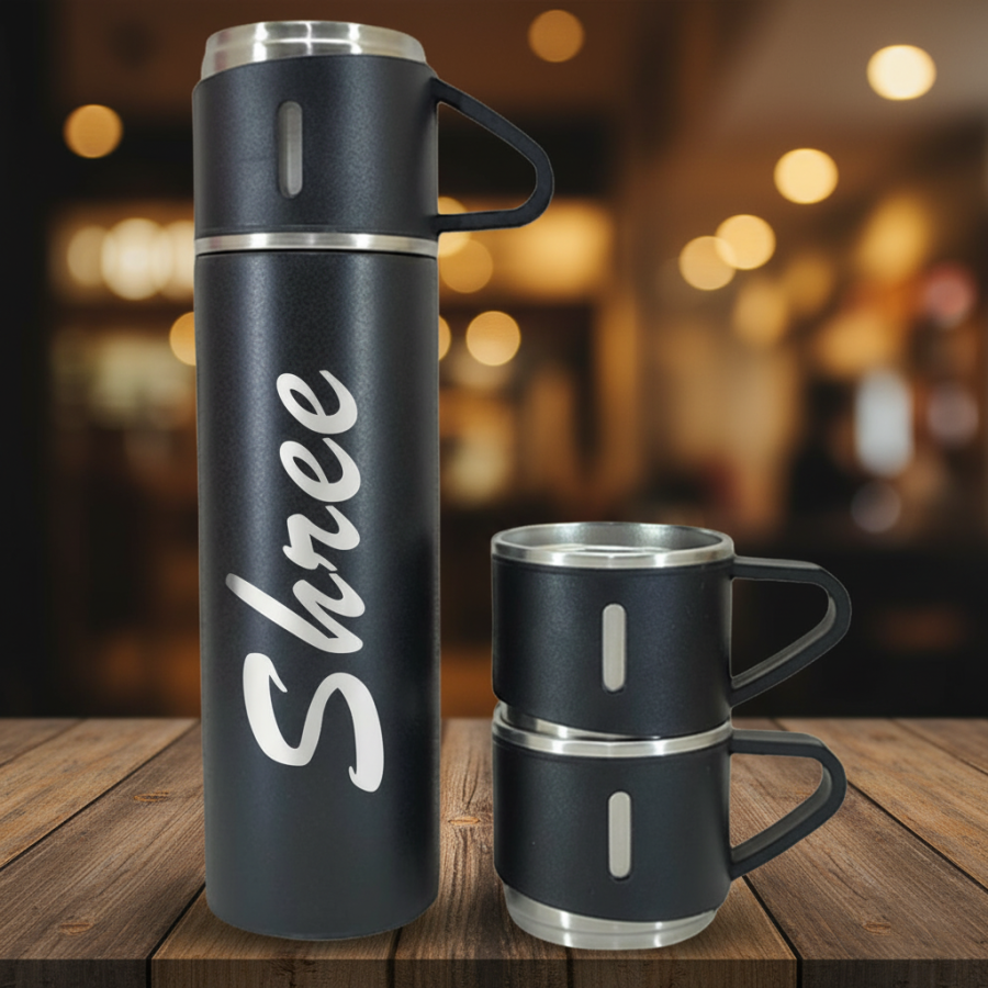 The Personalized Vacuum Insulated Flask Gift Set with 2 Cups is the ultimate way to keep your drinks at the perfect temperature while on the go. Whether you're sipping hot coffee or enjoying a cold beverage, this set ensures your drinks stay at the desired temperature for hours. Crafted with premium stainless steel and featuring a sleek, modern design, this insulated flask comes with two matching cups, making it perfect for sharing your favorite beverages with a loved one. Personalize it with names, initials, or a special message to make it a unique and thoughtful gift for friends, family, or colleagues.