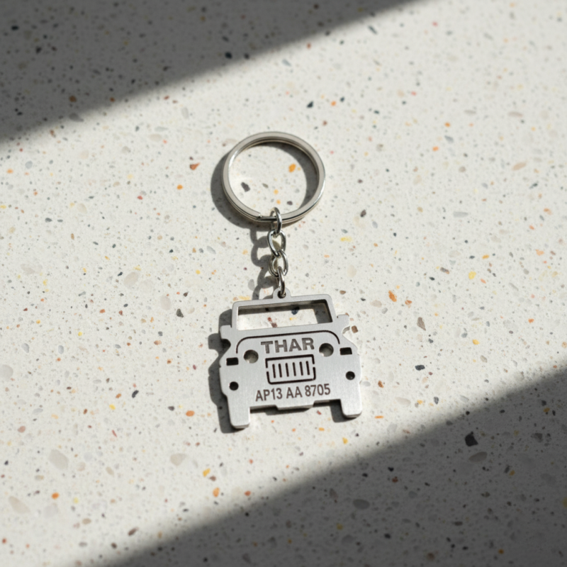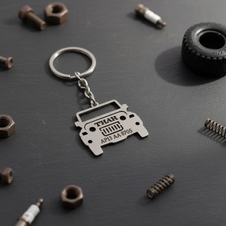 Celebrate your love for adventure and the iconic Mahindra Thar with the Personalized Thar Keychain. This custom keychain is the perfect accessory for any Thar enthusiast, offering a sleek and stylish way to show off your passion for this legendary SUV. Made from high-quality materials, it’s built to last and can be personalized with a name, initials, or a custom message, making it a unique and meaningful keepsake. Whether you're gifting it to a Thar lover or treating yourself, this keychain is a fantastic reminder of your love for driving and adventure.