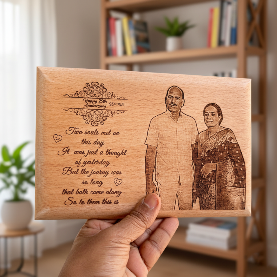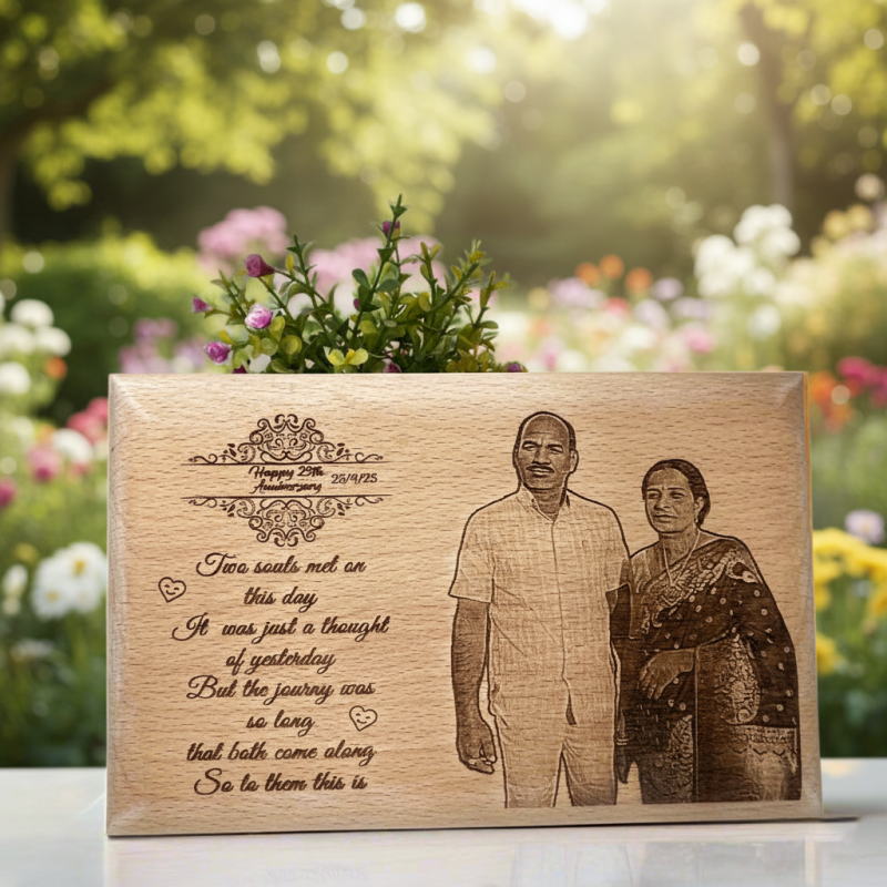Celebrate 25 years of love, memories, and commitment with this beautifully crafted Personalized Wooden Photo Frame. Made from high-quality beech wood, this frame is designed to be a timeless keepsake, perfect for commemorating a couple's silver anniversary. The frame can be personalized with the couple's names, wedding date, and a meaningful message, making it a unique and heartfelt gift. Whether displayed on a tabletop or hung on the wall, this elegant frame will showcase a cherished photo and serve as a constant reminder of 25 years of love and togetherness.