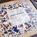 "Picture Polaroids piled up to form a pattern on vintage-rustic background with names and a caption laid over in a black frame.