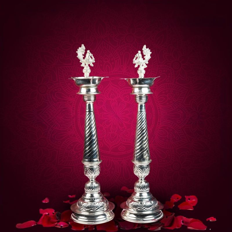 Whether for festivals, pujan ceremonies, housewarming, or an extravagant gift, this German silver diya set will bring warmth, respect, and flair into your space."