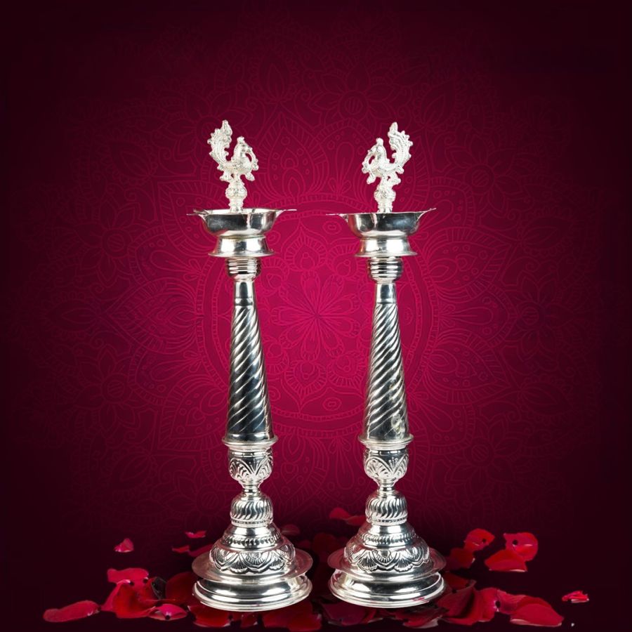 "Premium German Silver 22-Inch 2-in-1 Diya Set, Light up the space with elegance and tradition through the premium German silver 22-in-1-diya set. Made from high quality German silver, this beautiful set and details are practical and artistic. This will be a great combination of shape and functionality in your home.