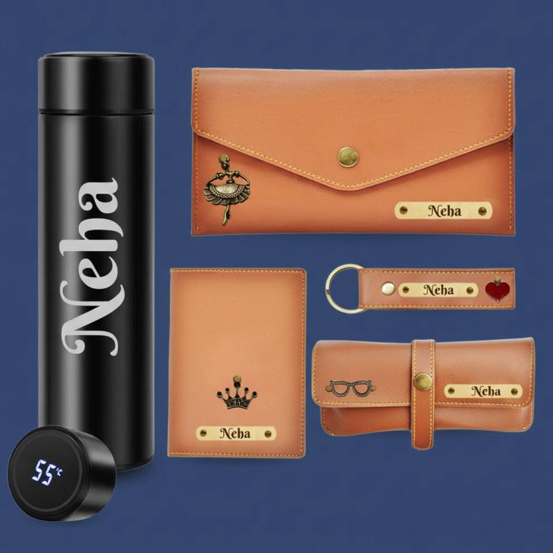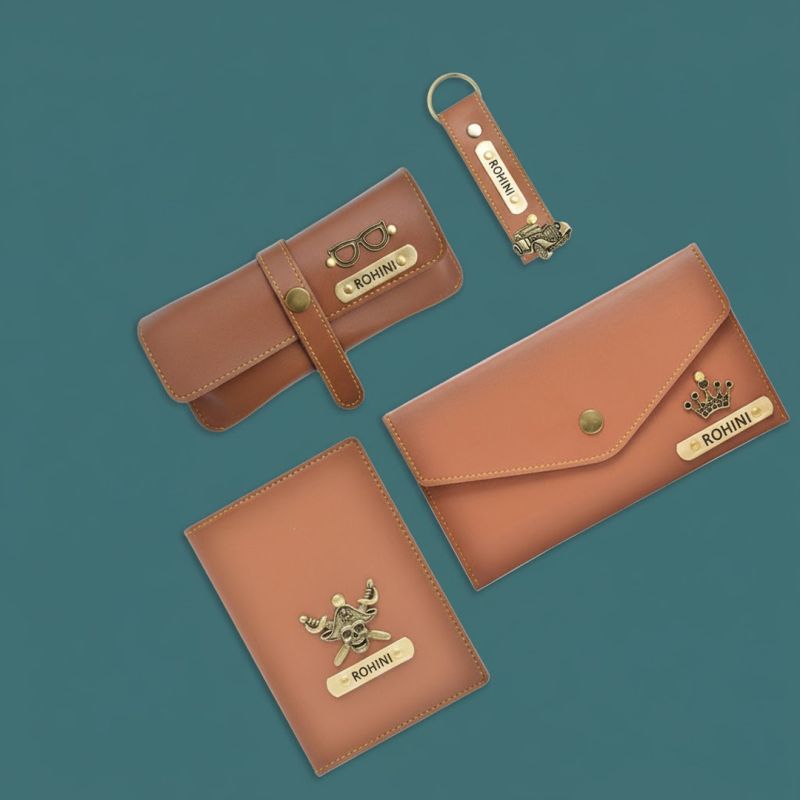 "Give her a gift that’s thoughtful, stylish, and functional all at once. The Women Gift Combo (Tan) includes a coordinated set of leather accessories—wallet / clutch, passport cover, eyewear (glass) case, and keychain—designed to complement each other and simplify her everyday carry.