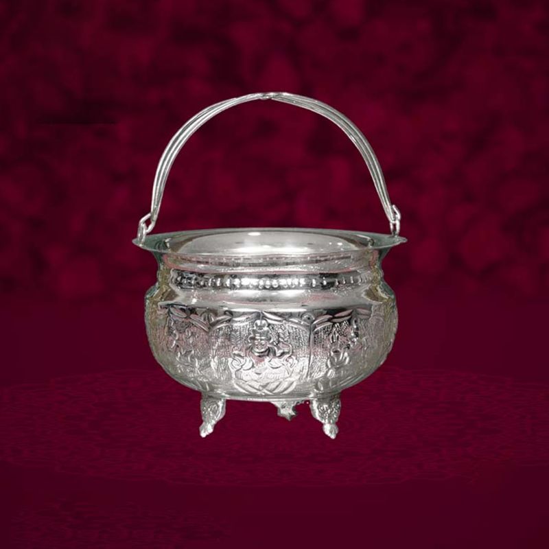 Elevate your ceremonial décor with this Pula Butta—a beautifully handcrafted German silver basket designed for wedding rituals, poojas, and festive decorations