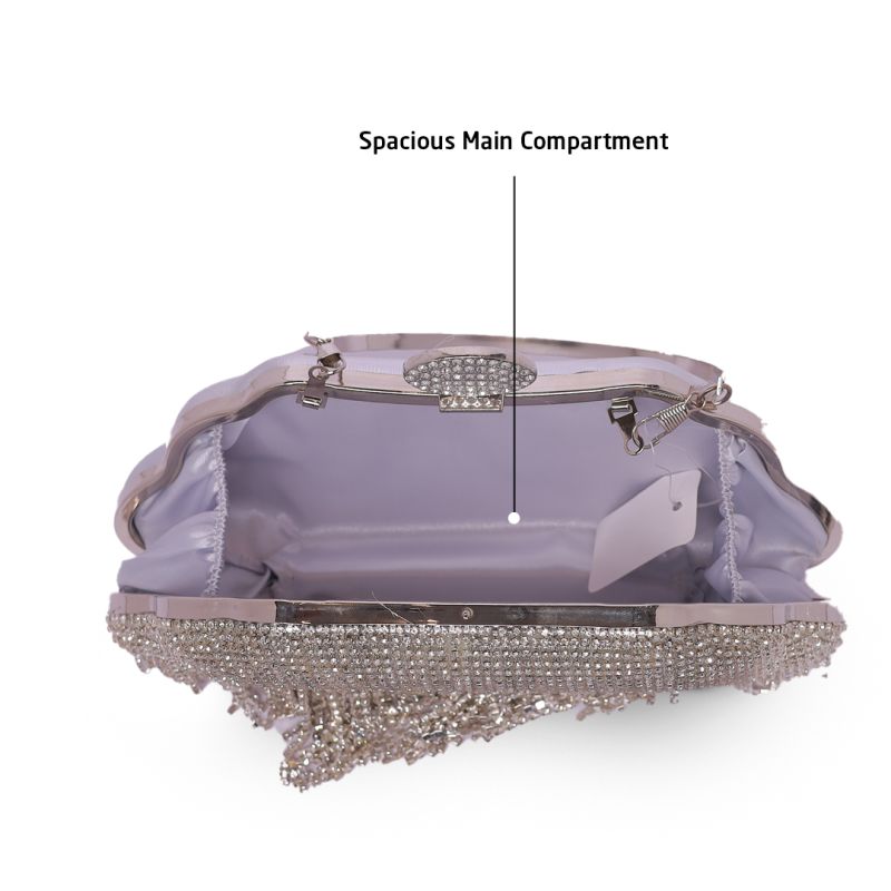 Nothing defines elegance and opulence quite like a royal clutch purse adorned with crystal tassels, intricate detailing, and an Silver Chalice Silver finish. The Royal Intricate Crystal Tassels Silver Chalice Silver Clutch Purse for Women is a masterpiece of craftsmanship, designed for women who love to make a statement with their accessories