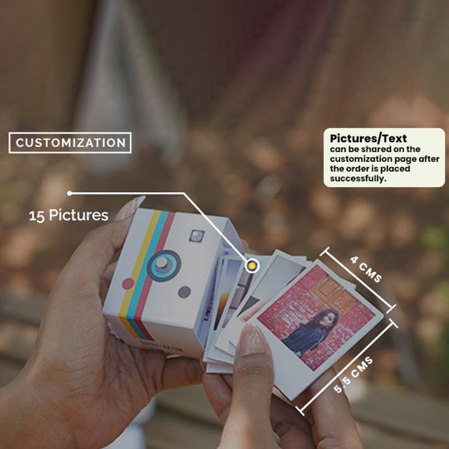 Name printed cover design complementing the colorful polaroids, making a perfect gift for your photo-freak friends.