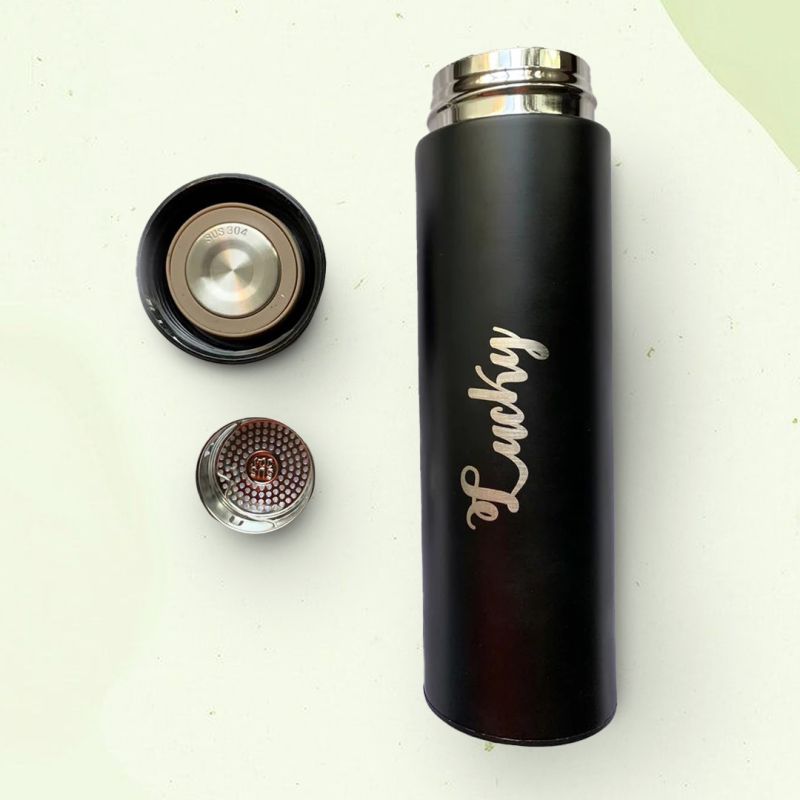 This stainless steel water bottle is the perfect gift for a close friend. The LED touch-screen display depicts the current level of your beverage's temperature and allows you to accurately track just how warm or cool it is to ensure that you wake up refreshed every morning. It will be much appreciated by anyone who loves tea or fruit infused water, as it comes with a strainer on the go so that one can easily make healthy drinks without any hassle. Personalize this thoughtful gift with a name!"