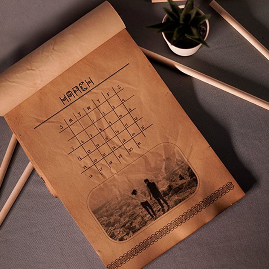 A corroded-looking calendar of A4 size, designed for some vintage touch on your walls.